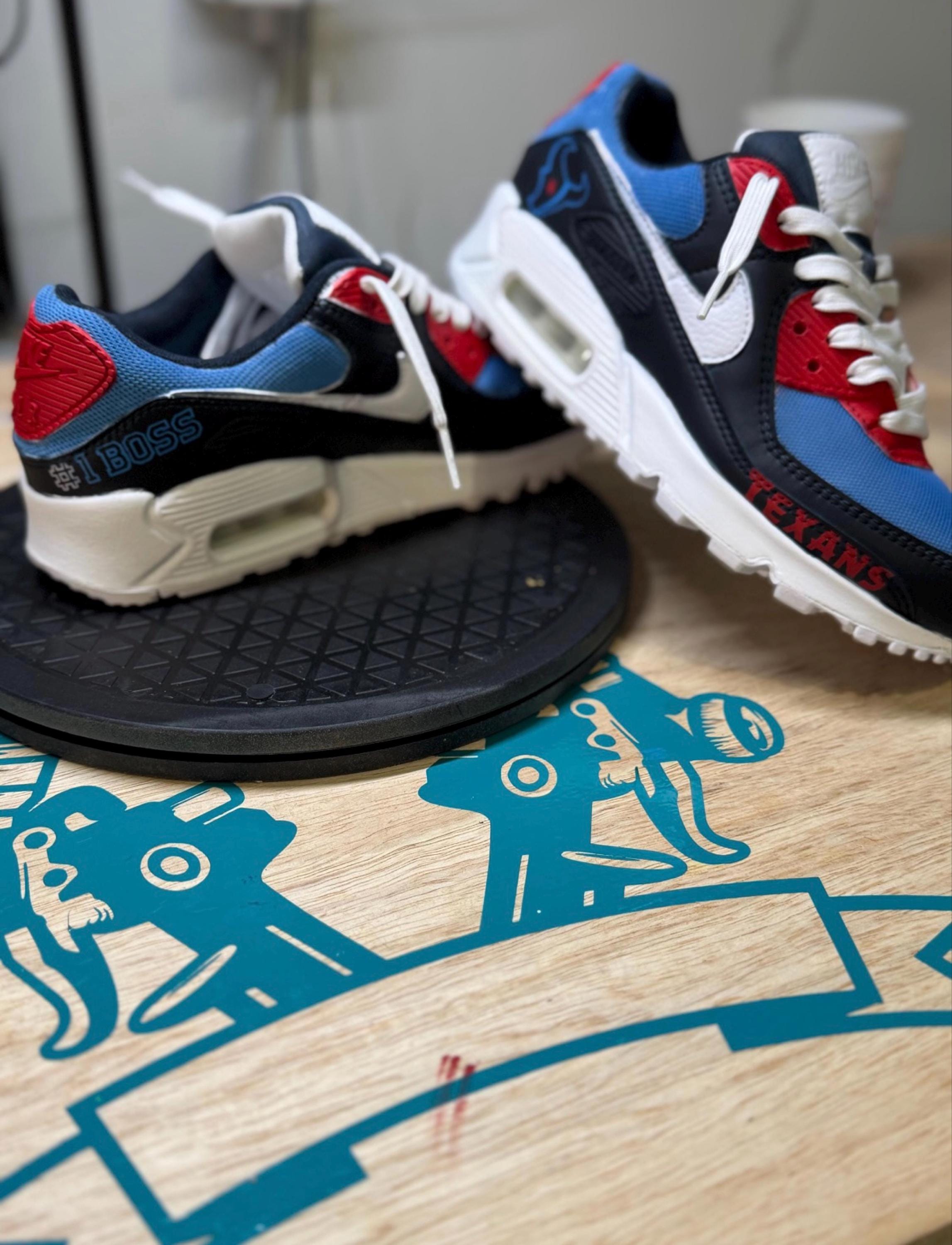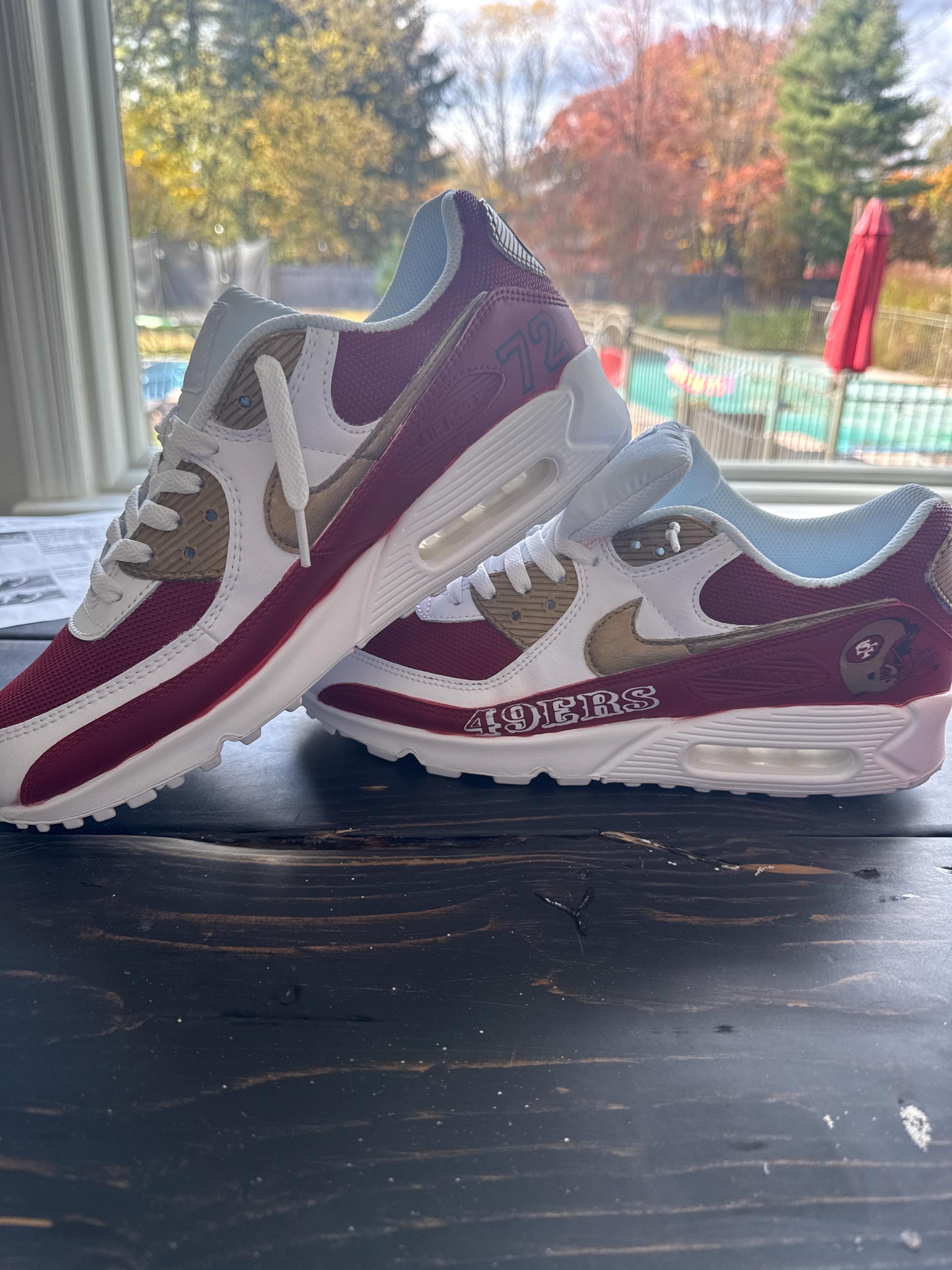 Step into game day with bold style in these custom Nike Air Max 90s. Hand-painted in vibrant team colors, these sneakers celebrate team pride while keeping the classic comfort of Air Max.